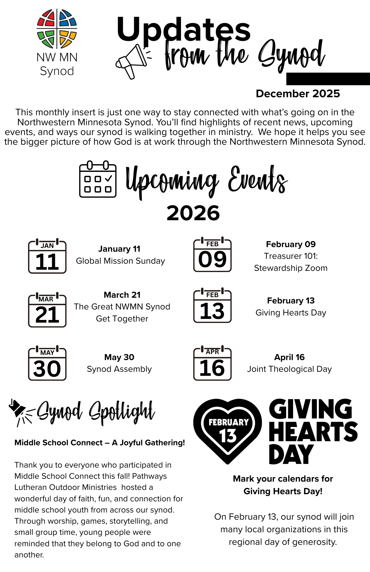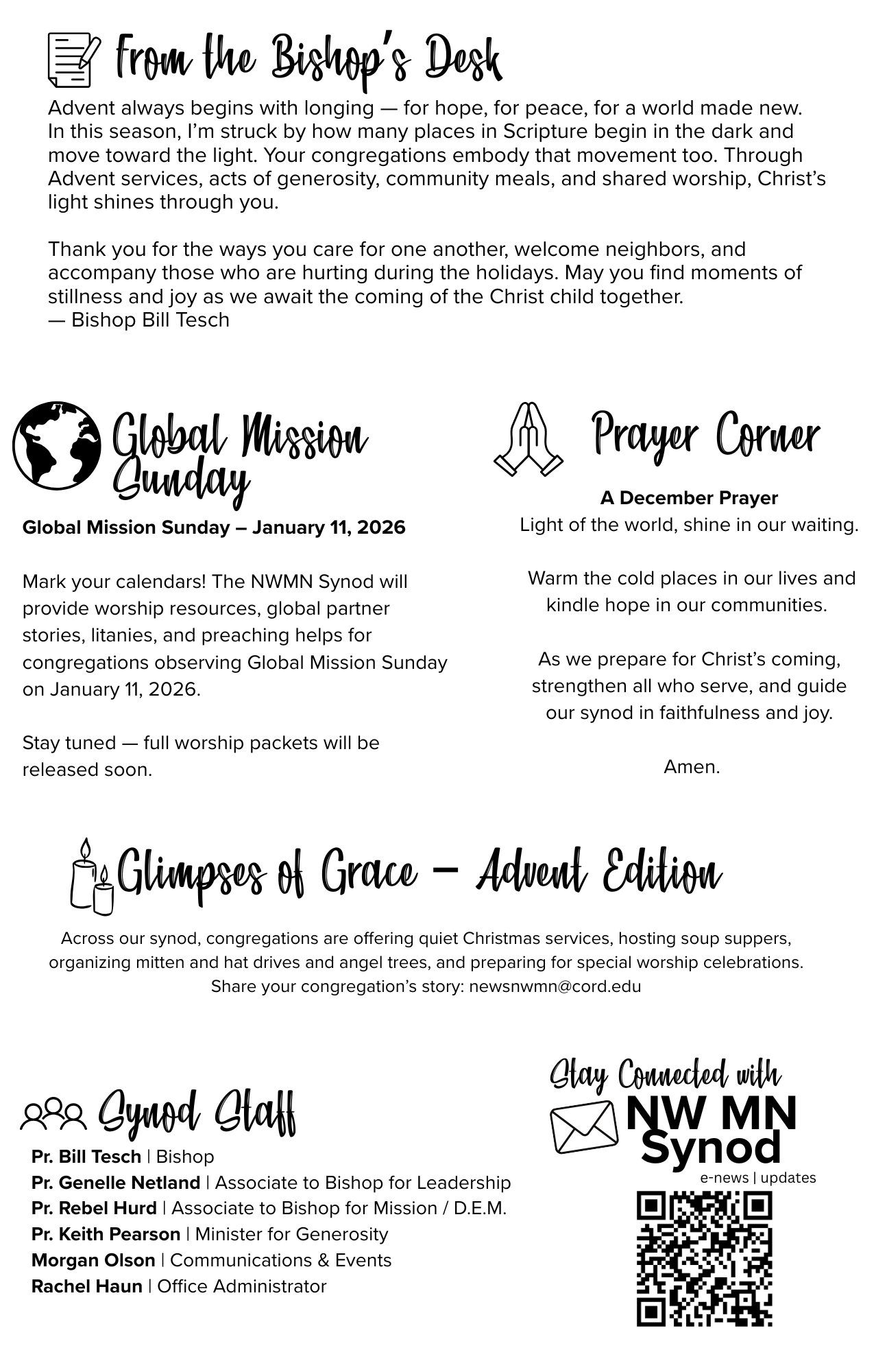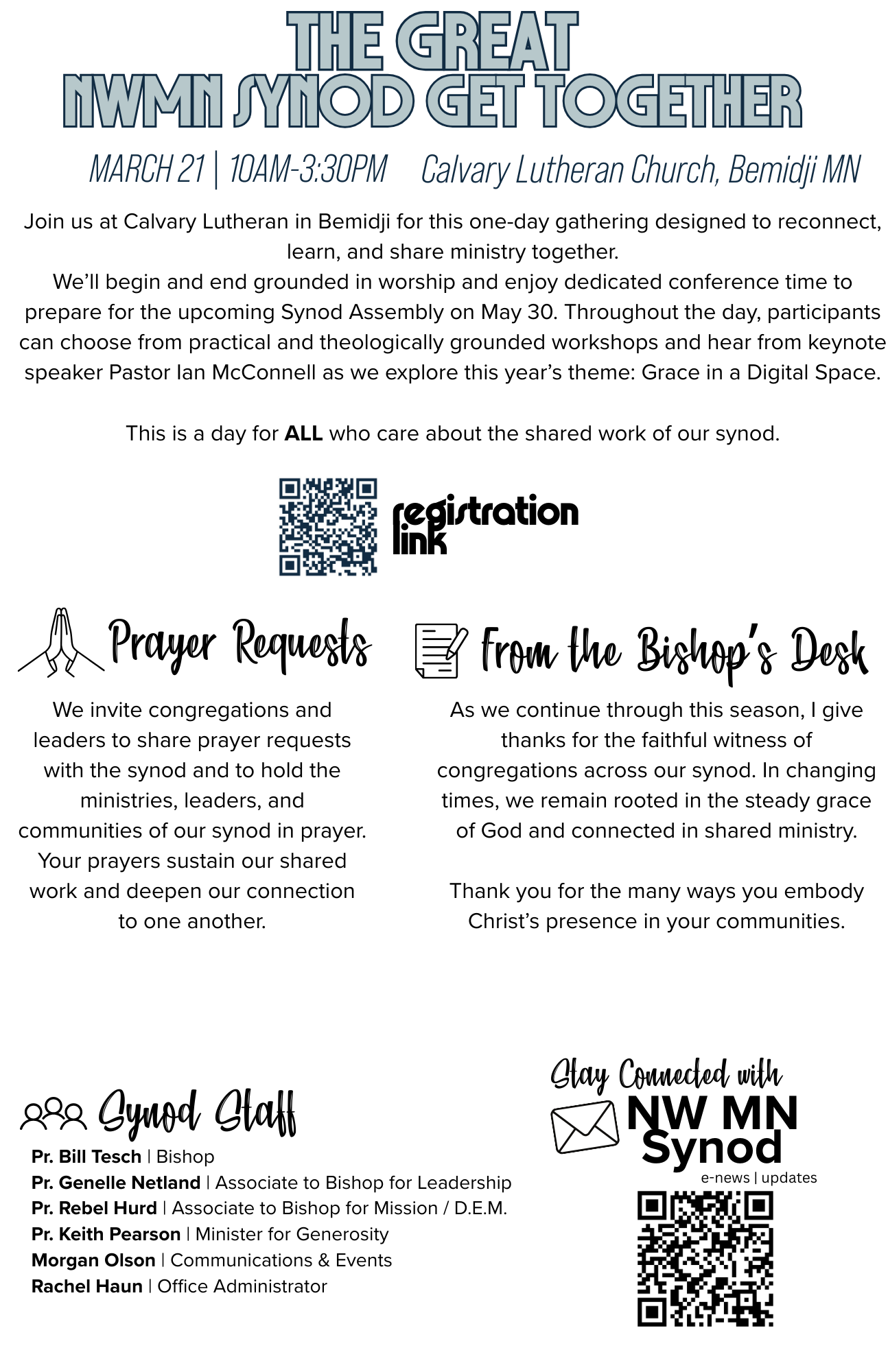 To help keep congregations connected, the synod office is launching a new half-page, double-sided monthly bulletin insert. Each month, this resource will highlight synod news, upcoming events, and ways to get involved. Churches can print and tuck it into bulletins, share it in newsletters, or display it digitally. A QR code is also provided for those who wish to project it on screens or share it online, making it easier for everyone to stay in the loop about what’s happening across our synod!
